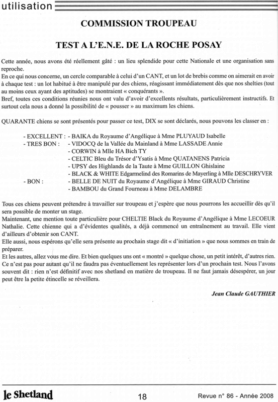 En 2008,Corwin a réussit avec brillance le test sur troupeau lors de l'E.N.E à la Roche Posay. Sur 40 chiens, seuls 10 ont été déclarés aptent pour le troupeau. Cliquez sur l'extrait pour lire visiblement; c'est un extrait de la revue du Shetland publié chaque année.